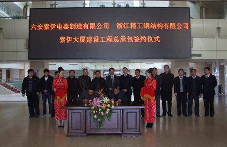 2011年2月23日上午11時(shí),六安索伊電器制造有限公司與浙江精工鋼結(jié)構(gòu)有限公司在六安經(jīng)濟(jì)技術(shù)開(kāi)發(fā)區(qū)管委會(huì)就索伊大廈建設(shè)工程總承包正式簽訂合作協(xié)議。 索伊電器董事長(zhǎng)王瓊峰、行政總監(jiān)程建榕、李曉泉、聶厚寶、孫玉勝,浙江精工...
