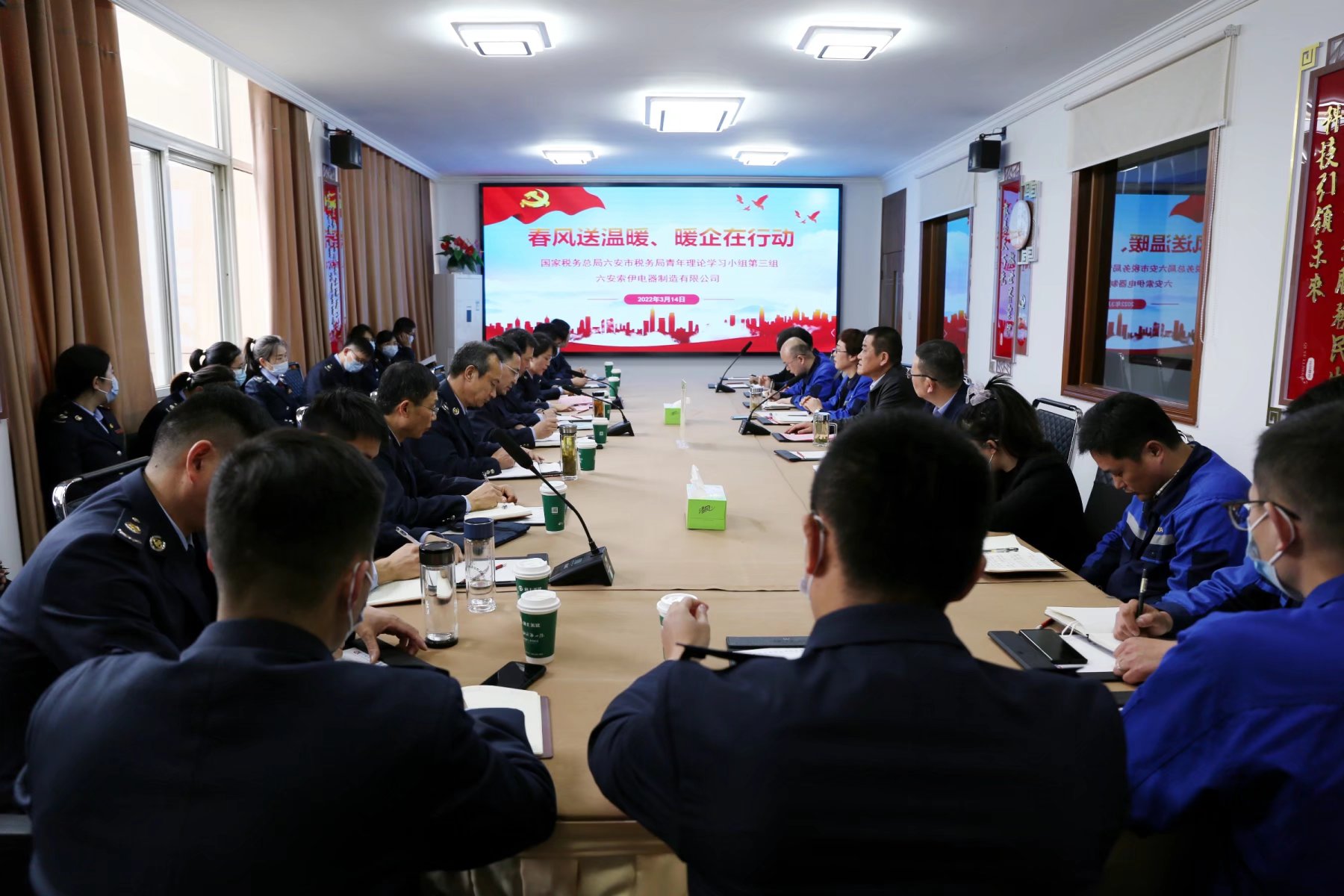 2022年3月14日下午,國家稅務總局六安市稅務局青年理論學習小組第三組“暖企行動”暨中共國家稅務總局六安市稅務第一稽查局、第二稽查局支部委員會主題黨日活動在六安索伊電器公司舉行。六安索伊電器制造有限公司董事長王瓊峰、黨委書記...