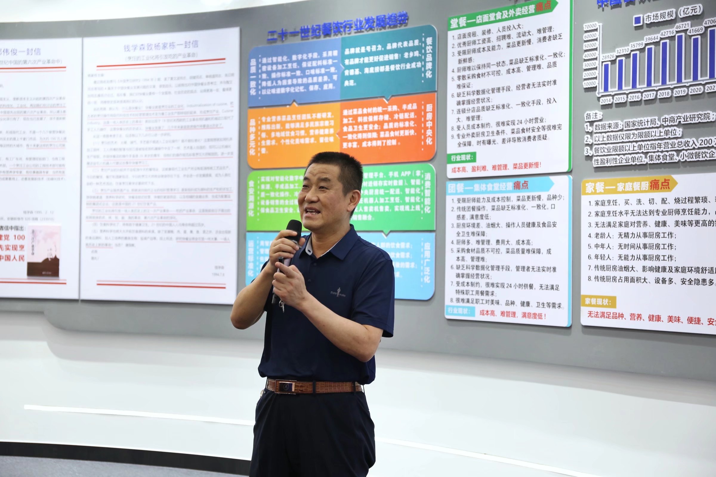 最后來到了剛剛新建的轉(zhuǎn)型展示廳,一進(jìn)展示廳,主背景墻上的二行紅白鑲嵌的發(fā)光大字——“打造智慧餐廚項(xiàng)目工程,制造智能數(shù)字廚電產(chǎn)品”,顯得特別醒目,也突出了此展示廳的核心功能。王董事長從索伊集團(tuán)的成立講起,二十多年來,索伊集團(tuán)走過風(fēng)雨,走過輝煌,曾創(chuàng)造了家電下鄉(xiāng)期間索伊冰箱全國銷量第六名,位列民營企業(yè)前茅的奇跡。從2012年以后,企業(yè)不斷地探索,堅(jiān)持走升級轉(zhuǎn)型之路,通過多年的探索,最終確定以“智慧餐廚項(xiàng)目工程”為核心的發(fā)展方向,以“智能化數(shù)字廚電新產(chǎn)品”研發(fā)、制造和應(yīng)用為核心打造智能化數(shù)字化產(chǎn)業(yè)集群,最終把錢學(xué)森在1995年提出的“烹飪工業(yè)化將出現(xiàn)在21世紀(jì)中國的第六次產(chǎn)業(yè)革命中”這一偉大構(gòu)想,通過索伊不斷的探索變成現(xiàn)實(shí)。王董事長也道出了探索的過程是漫長的,也是艱辛的,五年中企業(yè)尋找、洽談了100多個(gè)產(chǎn)業(yè)項(xiàng)目,最終創(chuàng)造性地總結(jié)出,隨著第四次工業(yè)革命到來,企業(yè)要想升級轉(zhuǎn)型,持續(xù)高速發(fā)展,必須具備八大要素,同時(shí)要選擇以四大“午陽”產(chǎn)業(yè)為發(fā)展方向。通過分析了家餐、堂餐、團(tuán)餐的現(xiàn)狀和痛點(diǎn),創(chuàng)造性提出了二十一世紀(jì)餐飲行業(yè)發(fā)展的八化趨勢,即“餐飲品牌化、廚房中央化、消費(fèi)智能化、應(yīng)用廣泛化、品質(zhì)一致化、品種多元化、食安溯源化、運(yùn)營標(biāo)準(zhǔn)化”,可謂是戰(zhàn)略眼光,思維超前,總結(jié)精辟,指導(dǎo)性強(qiáng),可操作性強(qiáng)。更神奇的是王董事長的創(chuàng)舉與科學(xué)家錢學(xué)森的構(gòu)想不謀而合,并且實(shí)現(xiàn)了錢老的預(yù)言,這不得不說是一個(gè)神化。