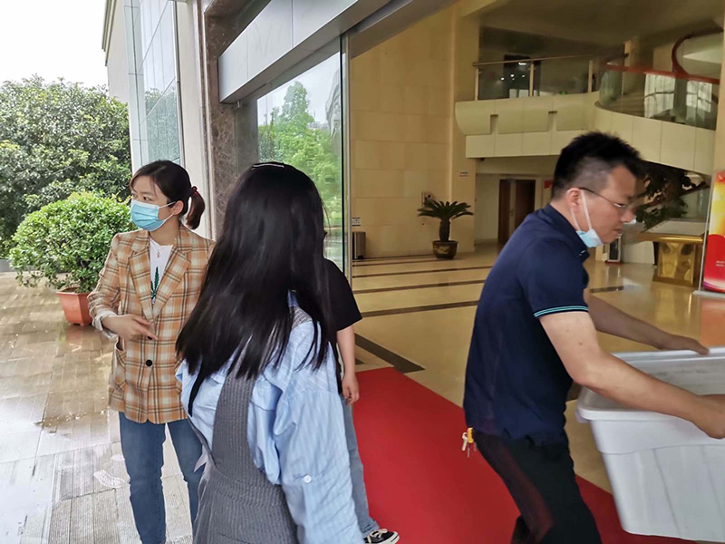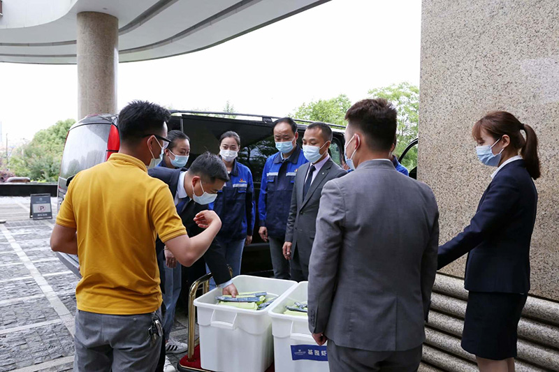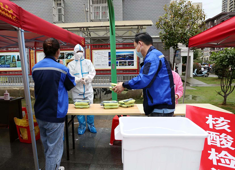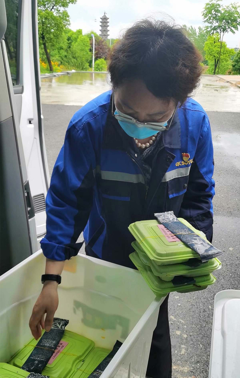 索伊集團領導班子辦事果斷,快速高效。從主動請纓到分裝配送僅僅只用了二個多小時的時間,1000份愛心餐出爐。2021年5月15日中午11:30,索伊集團董事長助理倪曙東、黨委書記汪顯華、索伊君瀾大酒店甲方代表劉杰帶領著集團的黨員志愿者們分別乘坐三部車,帶著近千份的智廚愛心餐前往轄區內的企業采集點、社區采集點、衛生服務站及醫護人員所住的大酒店進行發放,每到一處,都深深被醫務人員和廣大工作者的敬業精神所感動,他們放棄了休息日,加班加點,為轄區內的所有企業和居民進行核酸檢測,當索伊的黨員志愿者們把熱氣騰騰的愛心餐送到他們手上時,他們也連連說謝謝。從十一點半到十二點半,整整一個小時,索伊集團的黨員志愿者不辭勞苦,把愛心餐送到轄區內的二十多個采集點。