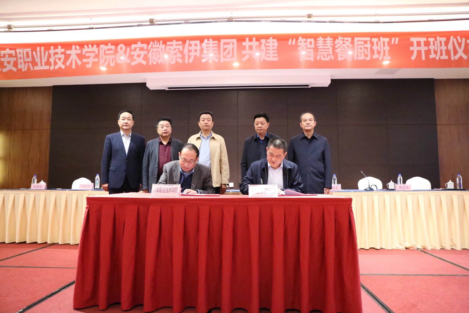 隨后,六安職業(yè)技術(shù)學(xué)院黨委副書記、院長葛向東和安徽索伊集團(tuán)董事長王瓊峰簽署了合作協(xié)議。最后,六安職業(yè)學(xué)院黨委書記周德福作重要講話。他說這次安徽索伊集團(tuán)與六安職業(yè)技術(shù)學(xué)院共建“智慧餐廚”班,就是探索校企合作的新模式,也是學(xué)院積極為企業(yè)服務(wù),為地方經(jīng)濟(jì)服務(wù)的具體體現(xiàn)。希望雙方相互合作,相互切磋,齊心協(xié)力把智慧餐廚班辦出特色,辦出好的效果。也希望同學(xué)們珍惜大好時(shí)光,認(rèn)真學(xué)習(xí),學(xué)好本領(lǐng),成就事業(yè),同時(shí)成就自己。